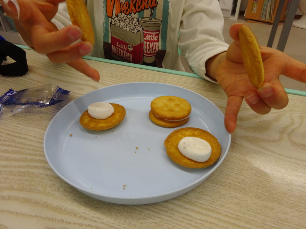その後もう一枚のお菓子を上にのせて、マシュマロをサンド!!