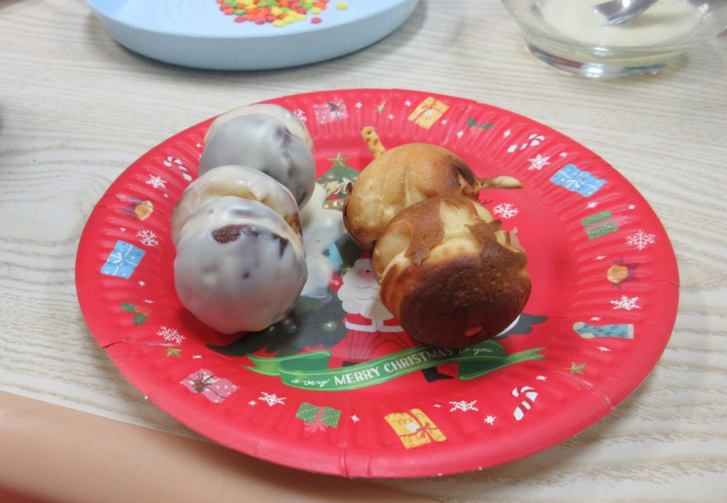 ホーットケーキミックスを丸くしたプッシュポップケーキを作りました。子どもたちの好みでデコレーションしたケーキには、個性はキラリと光ります。