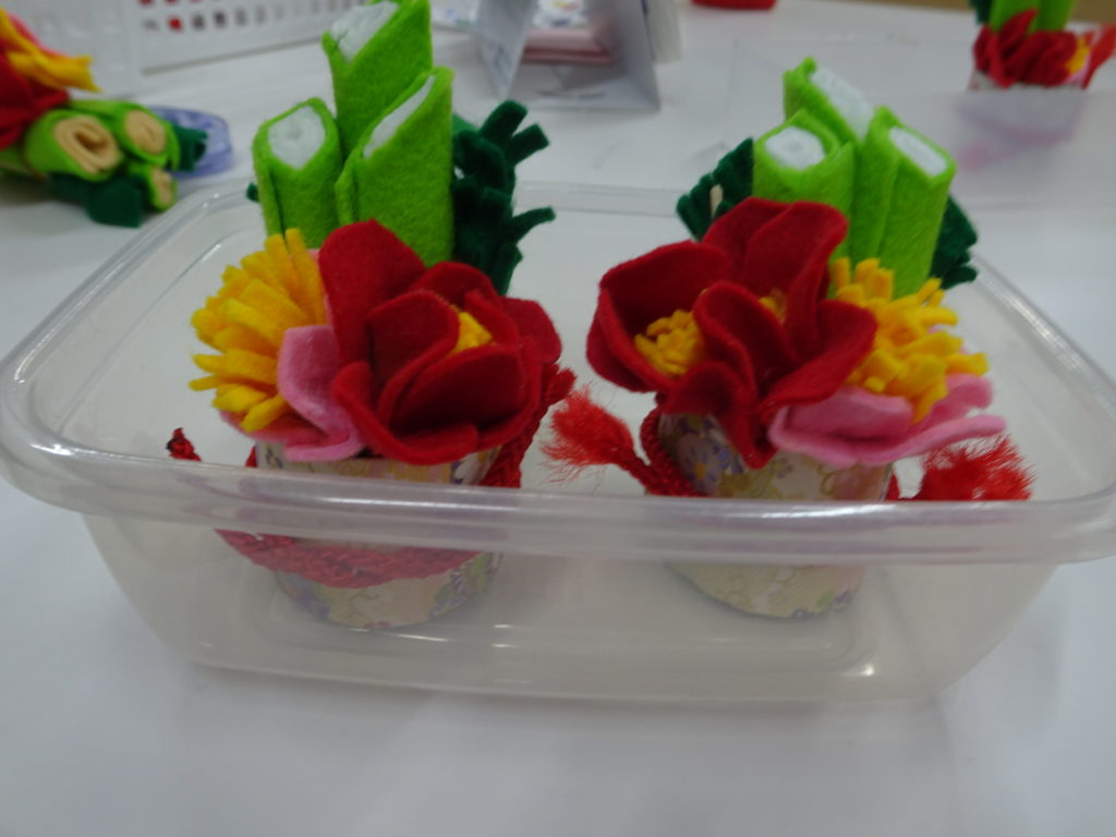 ミニミニ門松でフェルトだった為、一つ一つ丸めたり、ハサミでチョキチョキしたりして作りました。