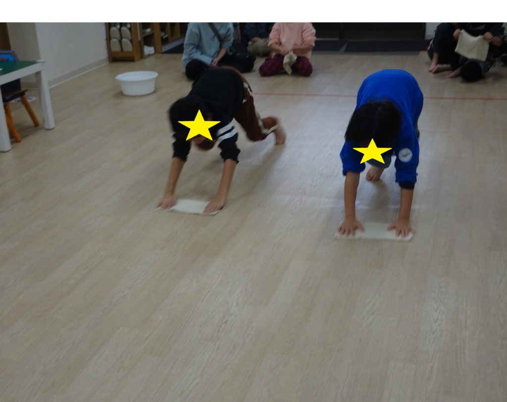 リレーなので雑巾がけをするとどんどん床が濡れてい行き、ツルツル滑ることもあり進むのに苦労する子も見られましたが、みんな頑張って進んでいきました。