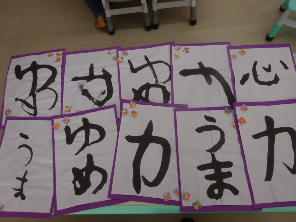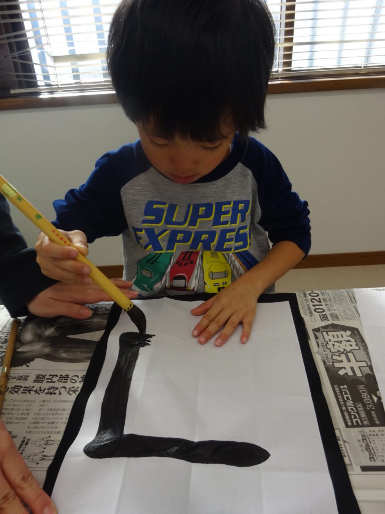 まずは先生と一緒に書いていきました。筆の使い方が難しく苦戦する姿もみられましたが、止めるところで支えたり、曲がるところで声をかけたりすることで書き進めていくことが出来ました。