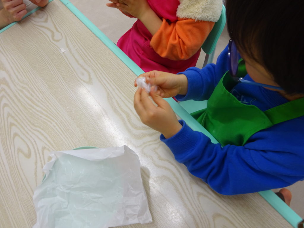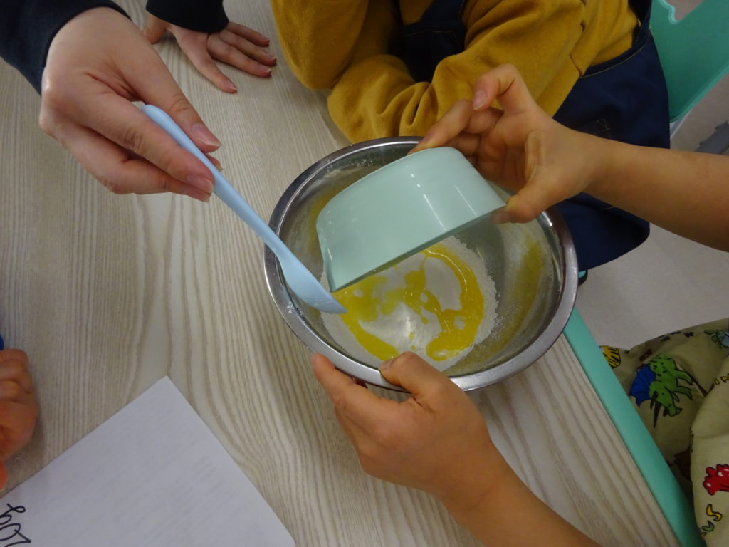 午後はおやつでスノーボールクッキーを作りました。材料を計ったり、材料を混ぜたりしていきました。計るグラムが小さいものはスプーンですくいながらゆっくり計ることが出来ました。
