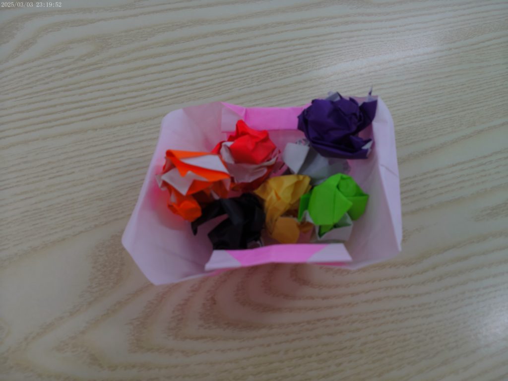 豆をいれるようきも折り紙でおりました。折り図をみながらわかないところは先生と協力して作ることができました♪