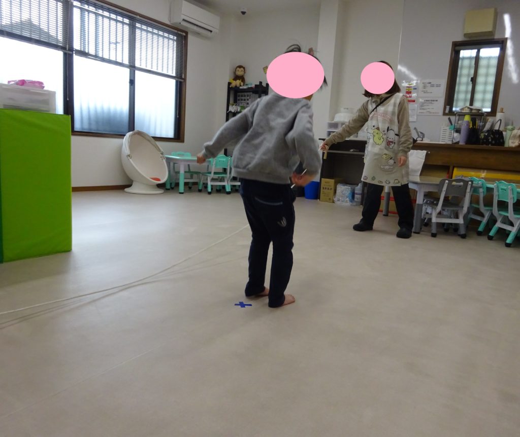 次に上下や左右に波を打つ縄をジャンプしたり、左右に動かしている縄をジャンプしていきました。動いている縄をよく見てジャンプしないと縄を踏んでしまい引っかかってしまいます。また、縄を見ながら同じ場所で跳ぶという視覚と身体を同時に使う動きに苦戦している様子も見られました。わかりやすいように、カラーテープで印を付けてみるとカラーテープも意識する事ができ、頑張って同じ場所でジャンプしようとする姿が見られるようになりました😊