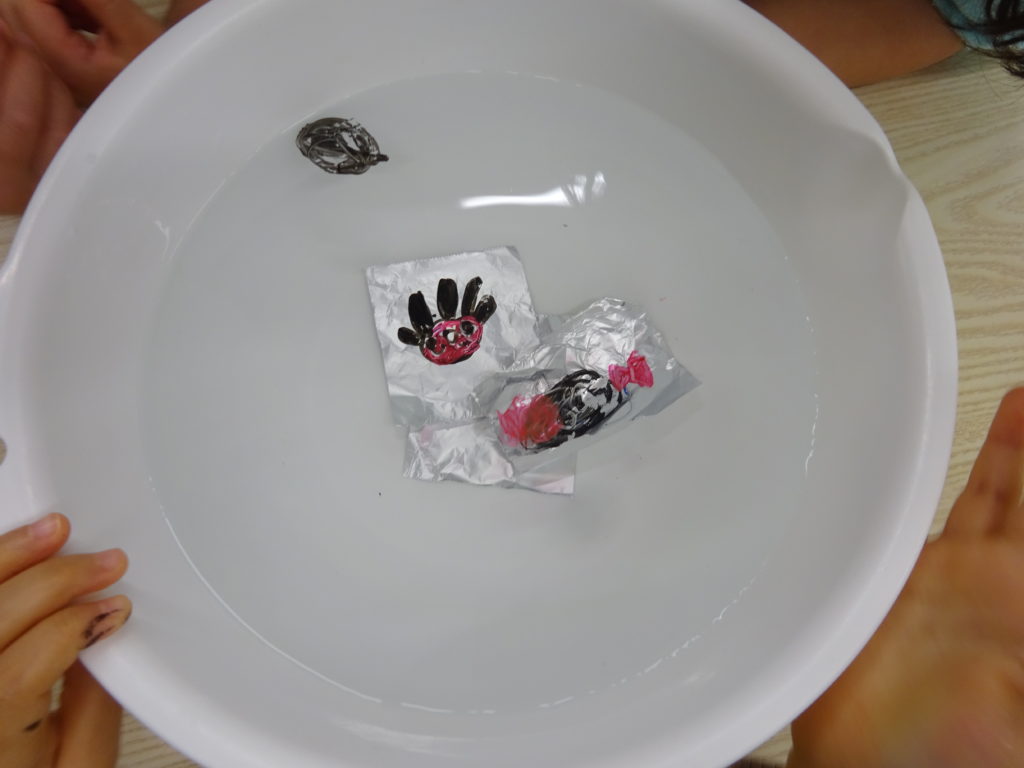 また、午後はぷかぷかタトゥー実験を行いました。アルミホイルのツルツルした面にホワイトボード用のマーカーペンで好きな絵を描いてもらいます。大きすぎたり、難しい絵は描かないで、絵の中は塗りつぶす事が実験成功へのポイントになります。ポイントをよく聞いたうえで何を描こうか考え、ハートや丸、星、タコなどの絵を上手に描いていました✨