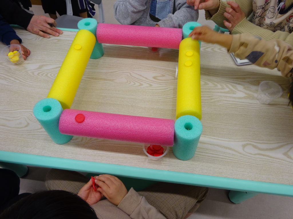 いかに振動を与えず、プールスティックの上に乗せていくと良いかを一人ひとり考えながらやっていくうちに次第とコツを掴んできてみんな上手に並べることができていましたよ(*^^*)