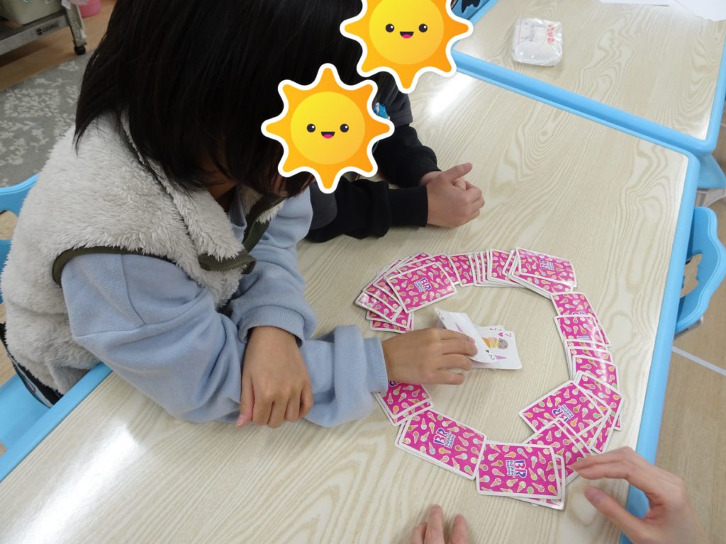 「ぶたのしっぽ」は1枚ずつカードを引き、同じマークが出たら真ん中の手札から全部取る。手持ちのカードが少ない人が勝ちというルールで行いました。「193」はカードを順に出していき、「1・9・3」のカードが出たら真ん中のカードから全部取るルールで沢山カードを取れた人が勝ちというルールのゲームです。「753」は「7・5・3・」のカードが出たら取るというルールのゲームです。瞬時に判断する必要があり、一歩及ばず取られてしまうと「あー」と悔しそうにしていました。