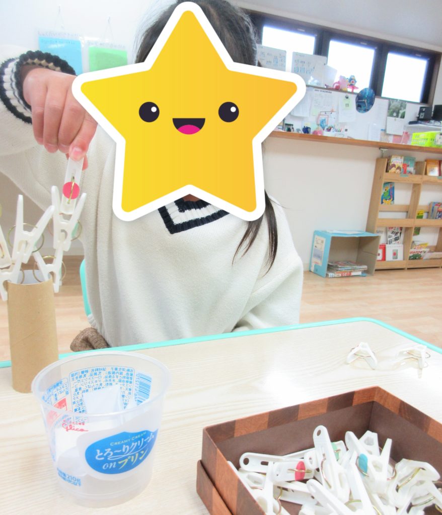 指先の機能向上をねらいとして、紙コップにピンチをどれだけ挟むことができるかに挑戦しました。