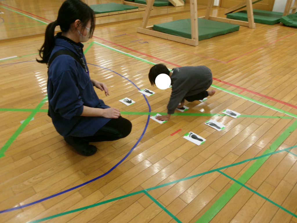 活動は、「全身マッチング」でした。床に貼られた「右手・左手・右足・左足」のマークに合わせて、自分の手足を正確に置くゲームです。