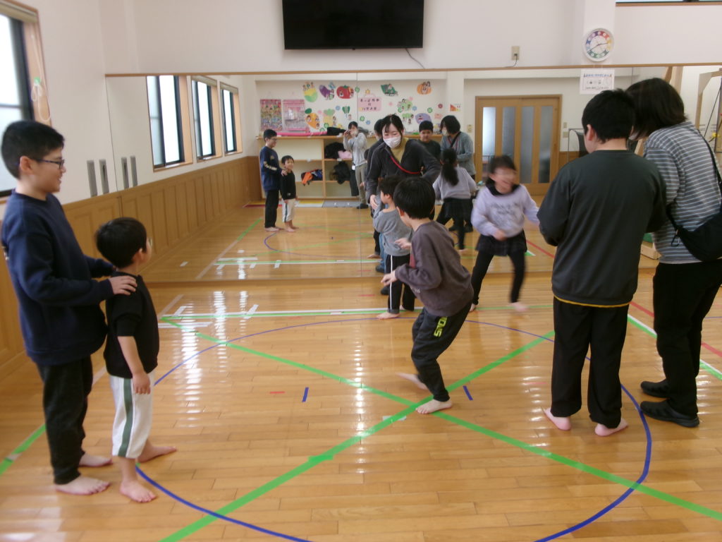 流れる音楽に合わせて、おおかみ役のお友だちの周りをぐるぐる周りました。最後、おおかみがおそいにくるのですが、「きゃー」といいながら嬉しそうに追いかけられていました。順番におおかみ役になり、どちらも経験できました。