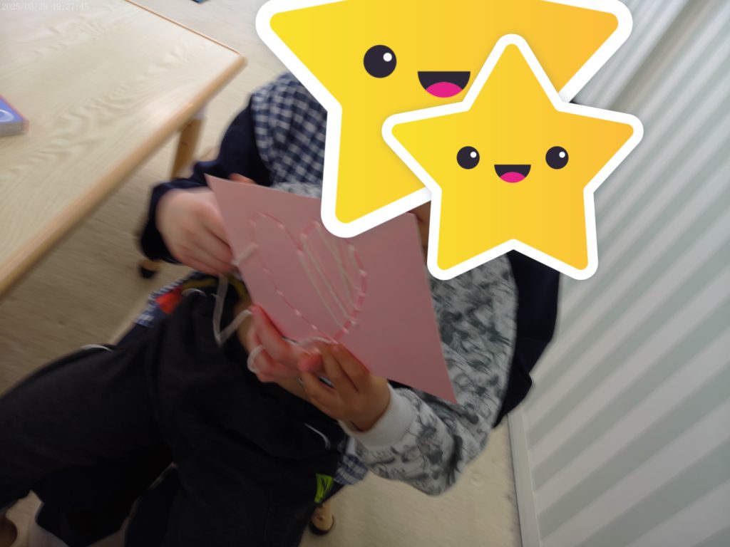 バレンタインメッセージカード作りでは表にハートの絵柄に毛糸を通して、デコレーションをしました。穴が小さいため、毛糸を通す作業に苦戦。どうやって通せばいいのかな?と始めは、疑問そうにしていましたが見本を見せるとあっという間に理解していましたよ😊どこの穴に糸を通そうかな、何色の毛糸で作ろうかなと楽しみながら作っていましたよ!!