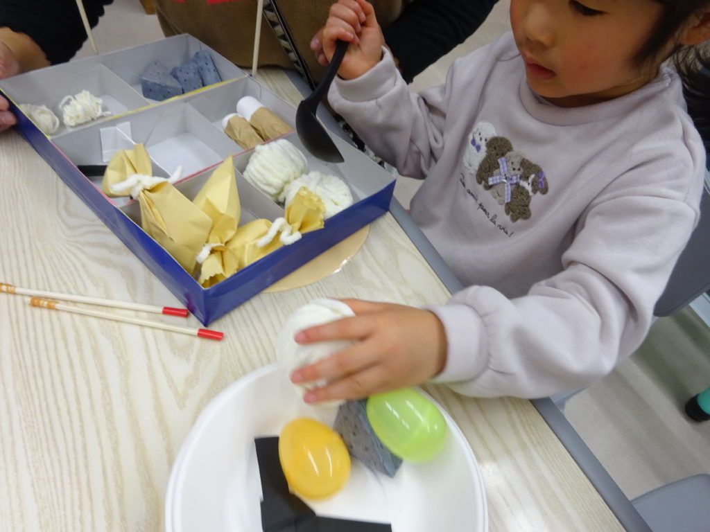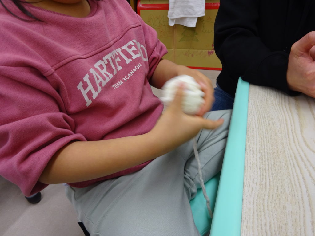大根としらたきづくりに挑戦していきました!白い毛糸を指にグルグル巻きつけたり、紙コップに巻き付けたりしていく工程が簡単そうに見えていざやってみると意外と難しく思うようにいかない事に不安になる様子も見られました。しかし、先生と一緒にゆっくりと行っていくことで感覚を掴んでくると巻くことが楽しくなり、「もう一個作りたい!!」と積極的につくる姿がありました(*^^*)