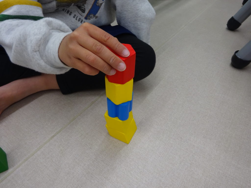 つみき積みでは、一つずつバランスを考えながら積んでいき、倒れても落ち込んだり、怒ったりする事無く再度積み上げと何度もチャレンジ!!楽しそうにする姿を見て、近くに居た子がやりたそうにしていると譲ってあげる姿もみられました。