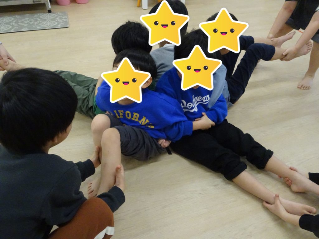 午後は大根抜きゲームを行いました。やったことがある子も多かったのでルールも分かりやすく抜かれないように両隣の子が一生懸命に腕を組んでいました。引っ張られる子も楽しそうに良い笑顔でした。