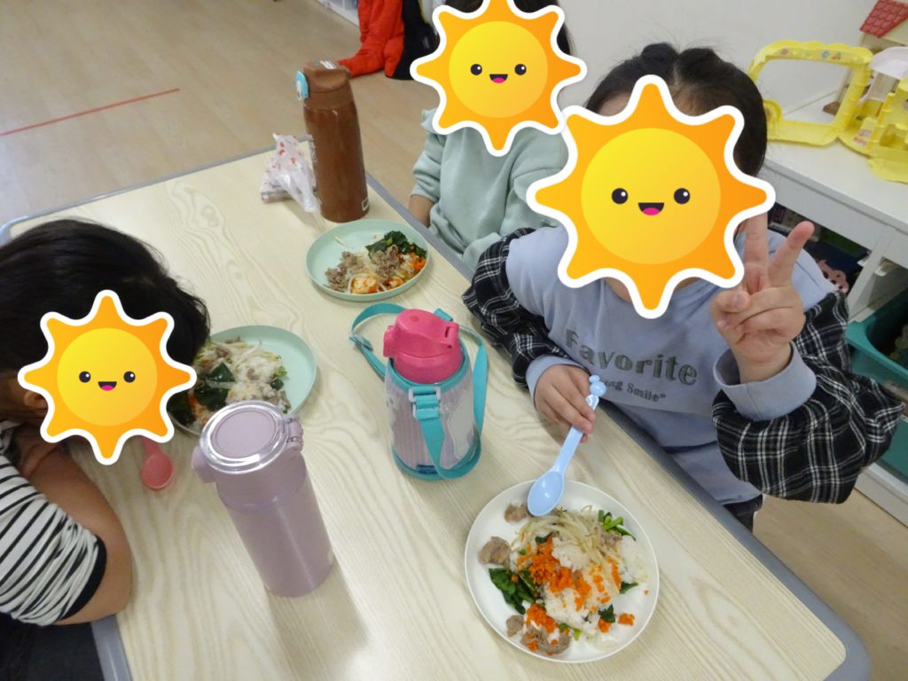 午前中はビビンバづくりをしました。ほうれん草チーム、もやし・肉チーム、ニンジンチームに分かれて作りました。「一口大ってどれくらい?」「みんなの親指くらいかな」と話していました。完成するのが待ちきれなくて味付けされたホウレンソウや人参を「味見していい?」と聞いて「おいしい!」と味見していました。混ぜ混ぜしながら食べておかわりもたくさんしていました。