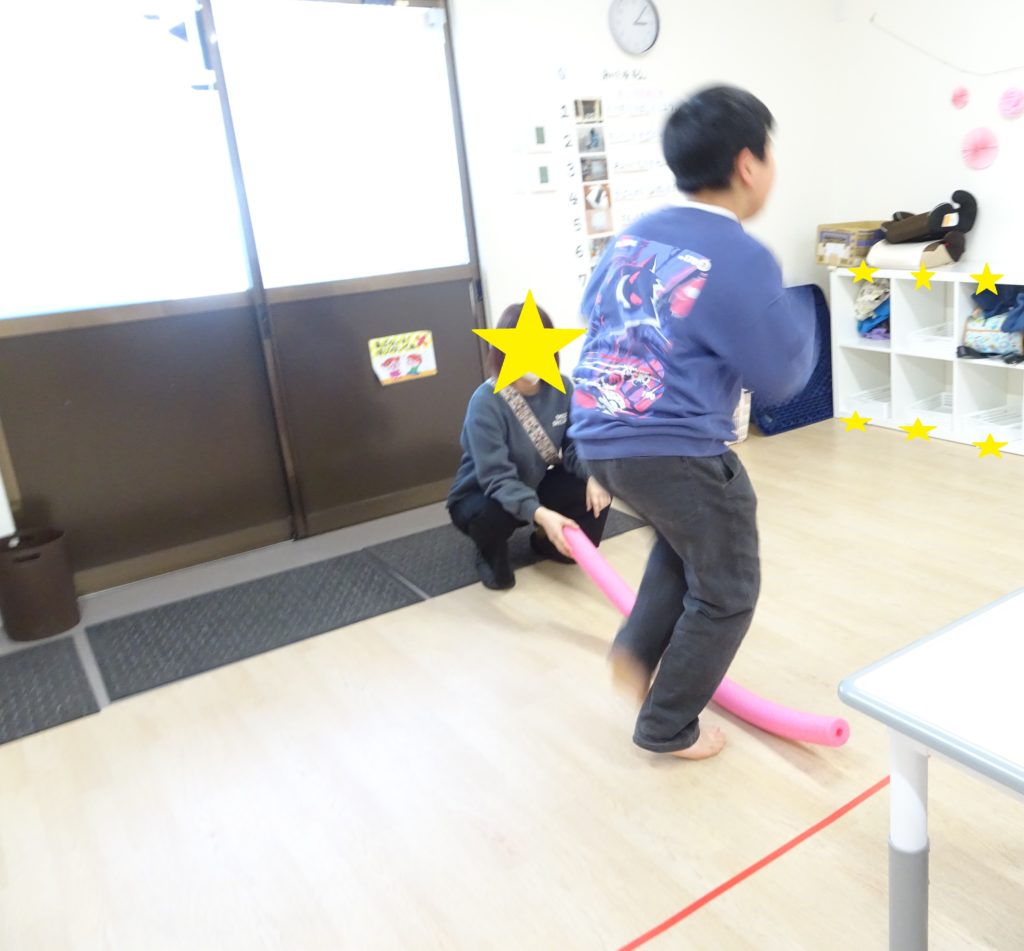プールスティックを職員が持ち、縄跳びの要領で足の下にプールスティックを運び、子どもがジャンプ♪