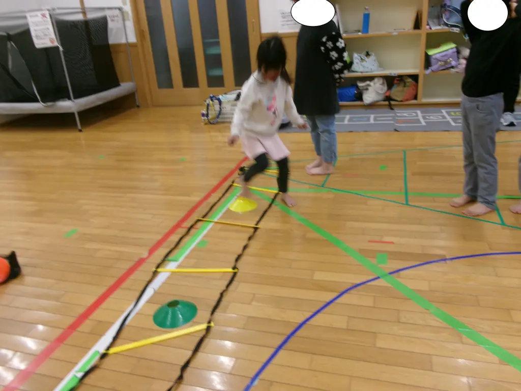 床に置いたはしご状の器具を使ってマスの中に足を入れてリズムよく進んでいきます。