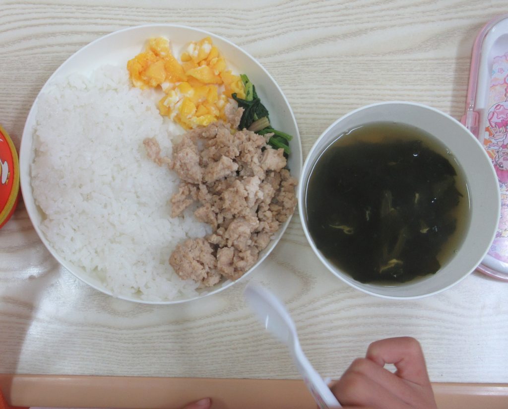ご飯はアイラップにお米と水、卵、鶏そぼろと調味料など各袋に分けて入れ湯煎をして作りました。