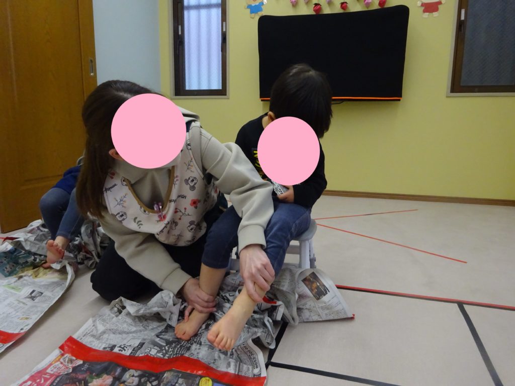 椅子に座り、長くつなげられた新聞紙を足の力だけで自分のほうに集めていきます。長い新聞紙をみると早くやりたくてウキウキの子どもたち(^^♪