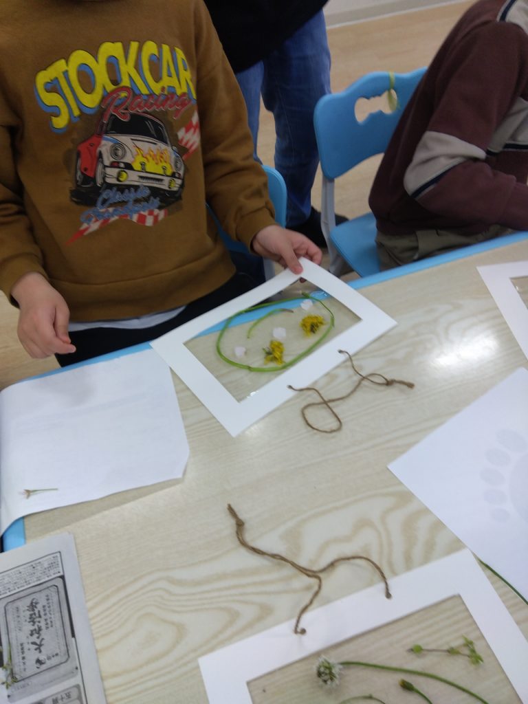 午後からは、公園で取った草花を使い制作を行いました。草花を綺麗に並べる子がいたり、草花の大きさによってまげて使ったり折って短くするなど上手に活用していました。草花でにこちゃんマークを作る子もおり、それぞれが素敵な作品を作っていました。使った植物が何か図鑑で調べてみたり、先生に画像検索を頼んだりしてこんな植物があるんだとちょっと植物に詳しくなりました。
