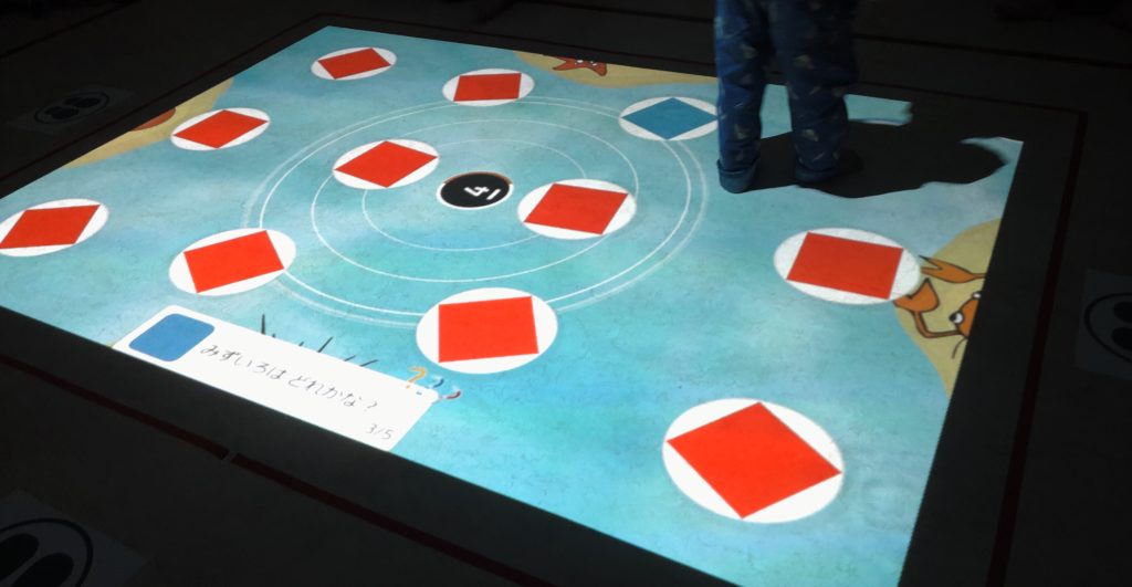 「○○いろをさがそう」とお題が出た後に、10秒で複数の選択肢の中から、お題の色を探して足で長押しして選択していくゲームです。10秒で全体を見渡し、どこにその色があるのかを見つけていくことと、色の認識、ルールを理解して取り組むゲームになります。
