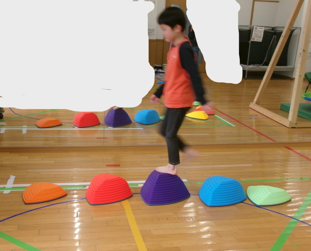 2026年4月9日(水)今日の運動プログラムは【バランス遊び】を行いました。平均台やバランスストーン、はしご等を使って落ちないようにバランスを取りながら進んでいきました。前向きで進むことはとてもスムーズに出来ていた子供たち。2回目以降は横歩きや後ろ向きもやってみよう!と声をかけると、チャレンジしていました。後ろ向きだと見えなくて「難しい」と言いながらも落ち着いて進んでいました。途中でバレルローラーにも乗って慎重に慎重に取り組めていました!「補助なしでできた!」とできることがまた一つ増えて嬉しそうでした😊