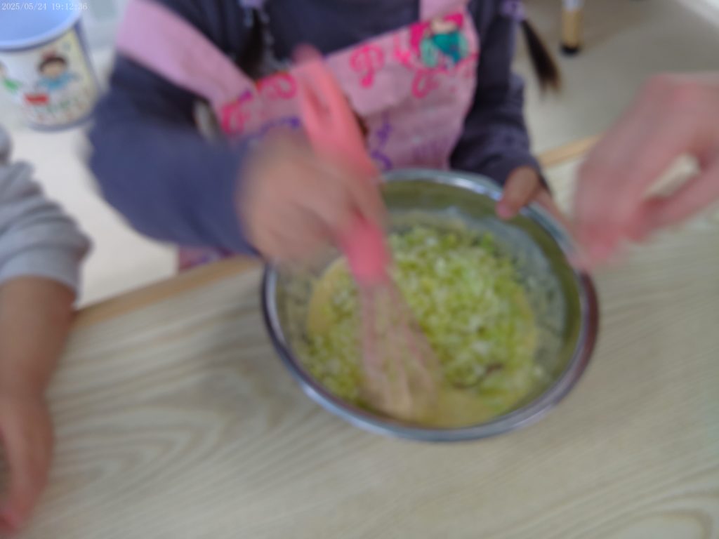 午前中の企画は、お昼ごはんに食べるお好み焼きを作りました。