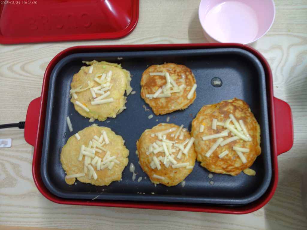 最初にクッキングのお約束と、お好み焼き作りの手順を確認してから作り始めました。最初に粉に水を入れてまぜまぜ。次にキャベツを小さくちぎり、ぶんぶんチョッパーに投入。細かくみじん切りにしました。生地の中にキャベツとコーンとツナ、卵を入れ、お好み焼きの生地の完成✨