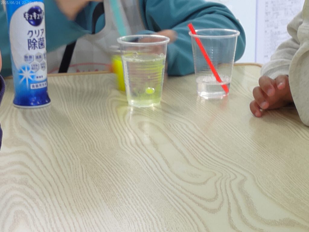 午後からは水と食器用洗剤、ストローを使った実験「水中シャボン玉」を行いました。ストローの先を数センチ液のシャボン液の中に入れ、もう一方の先を指でふさいでいきます。そして、ストローをシャボン液から数センチ上にだし、ふさいだ指を離すと中のシャボン液が落ちて水中にシャボン玉ができるという実験です。