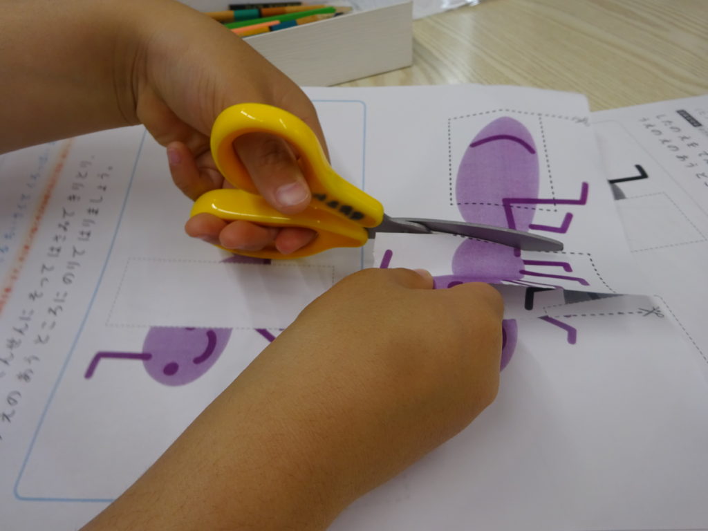 選んだのは「あり」。ハサミの使い方は難しく危ないので取り組む前にしっかりと確認をしてから行いました。どこを切るのか確認もしていきました。しっかりと切るところと刃先を見ながら切ることが出来ました。