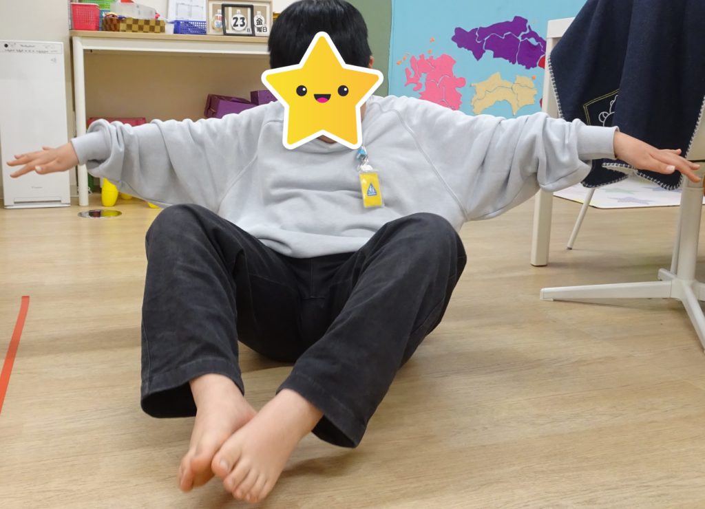 令和8年1月23日(金) 今日は座った状態で両足をあげて10秒キープできるのかの体幹トレーニングをしました。 「1・・・2・・・3・・・」と10秒数える間に両足が床につかないようにプルプルしながら頑張っていました。