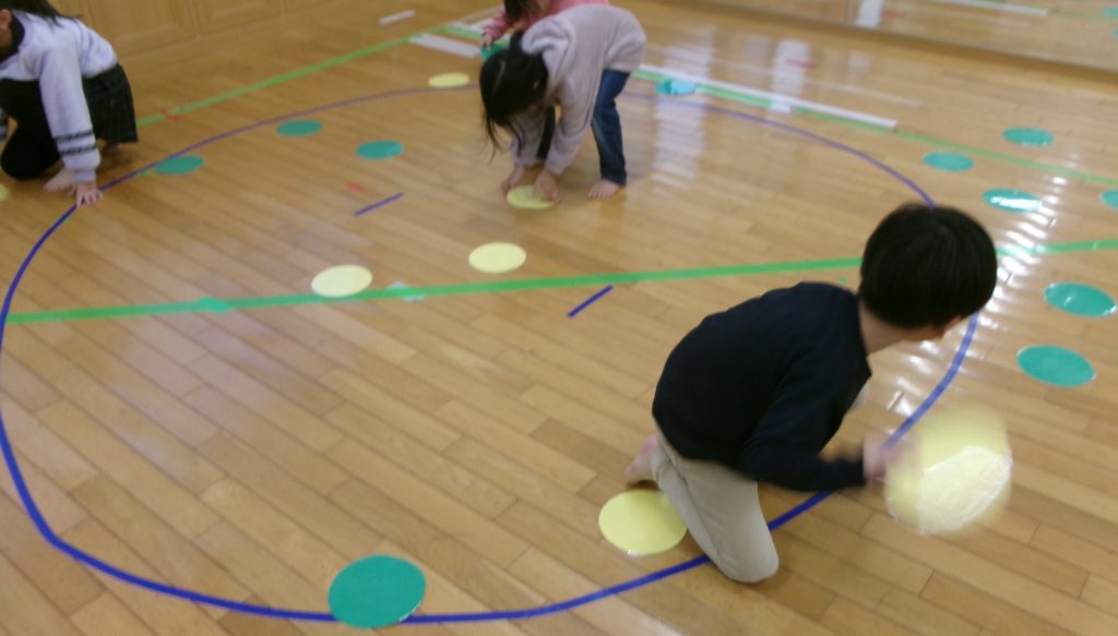 2026年2月13日(金)ひっくり返しゲームを行いました。 今回は緑チームと黄チームに分かれて、チーム対抗戦に挑戦しました。 床に並べたカードを合図と同時に自分のチームの色へひっくり返していきます。 時間いっぱい身体を動 […]