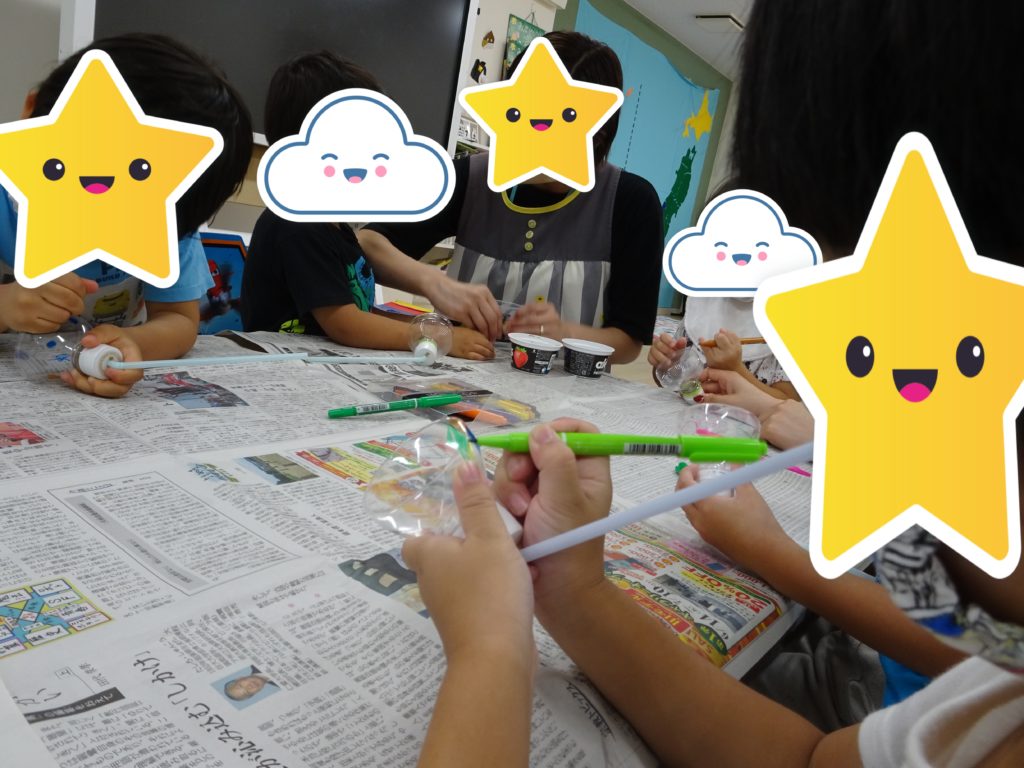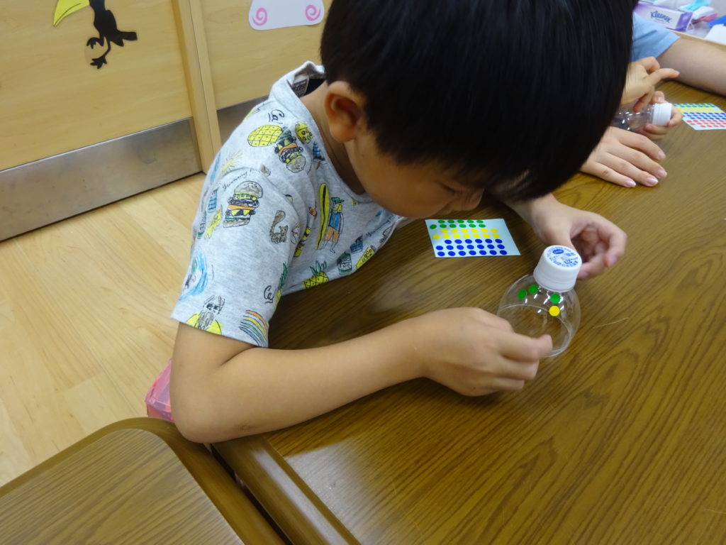 今日はペットボトルを使って制作しました。 材料を見るなり、「何を作るの??」と興味津々な子どもたち( *´艸`) 初めの作業はシール貼り。 赤を貼りたい子、青を貼りたい子、いろんな色をたくさん貼りたい子。 たくさんの考え […]