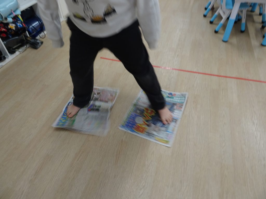 令和8年2月18日(水) 今日は、新聞紙を足でやぶれるかチャレンジをしました! 立ったまま新聞紙を足だけで破れるのか試してみました。上手に半分に破っていました。手を使えないので難しかったと思いますが頑張っていました。