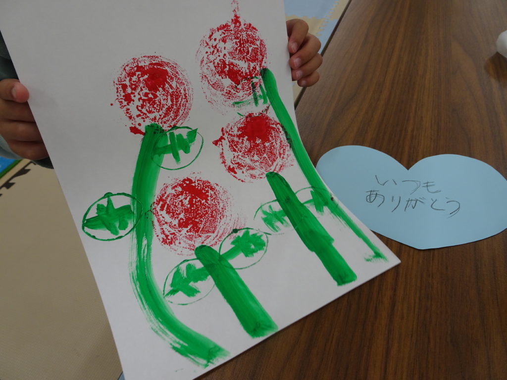 5月6日(金) ビニール袋に絵の具をつけ、 カーネーションのお花に見立てフラワーアートを楽しみました。 絵の具が紙につくと、「お花だ~かわいい」と 夢中になって取り組んでいました! 母の日の由来を簡単に伝えると、 「あり […]