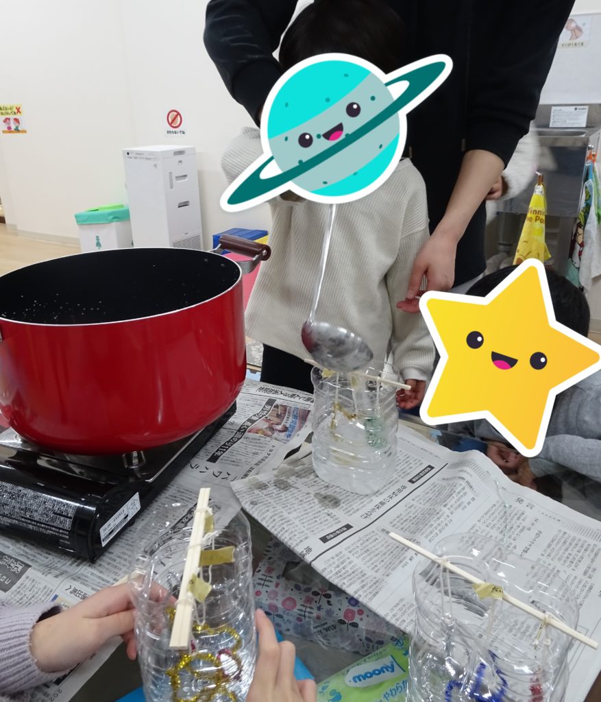 3月31日(木) 今日はキラキラモール作りをしました(^_-)-☆ まずは、大きなお鍋にお湯を沸かし大量の自然塩を みんなで分担して投入し、混ぜていきました♪ 大量の塩が溶けていく様子に、 「わ~!凄い!溶けてきた!!」 […]