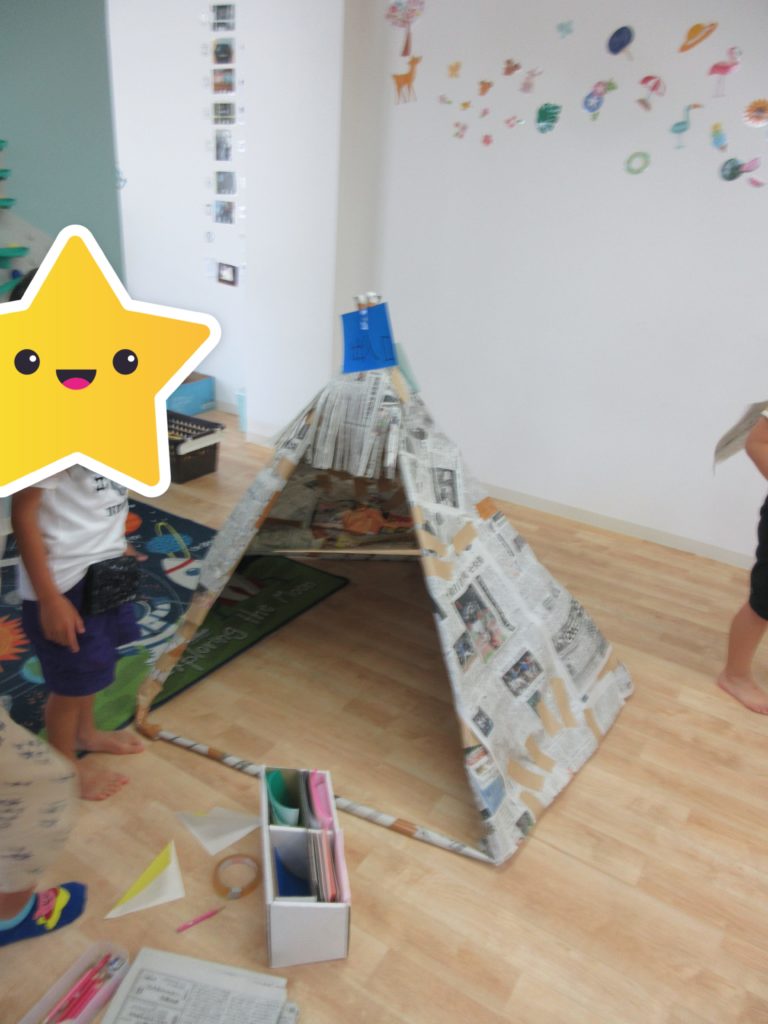 今日のテーマ活動はグループに分かれて新聞紙でテントを作りました。 はじめに新聞で作った骨組み用の棒を組み立て、そこに新聞紙を付けていきます。それぞれのチーム内でどこから貼るのか、なんのテープで貼るのかなどすべて子どもたち […]