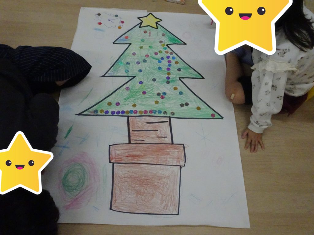 12月8日(金) 今日は、クリスマスツリーお絵描きをしました。模造紙のクリスマスツリーを準備。みんなで色を塗りました。シールを貼ったりと素敵なクリスマスツリーが出来ました。