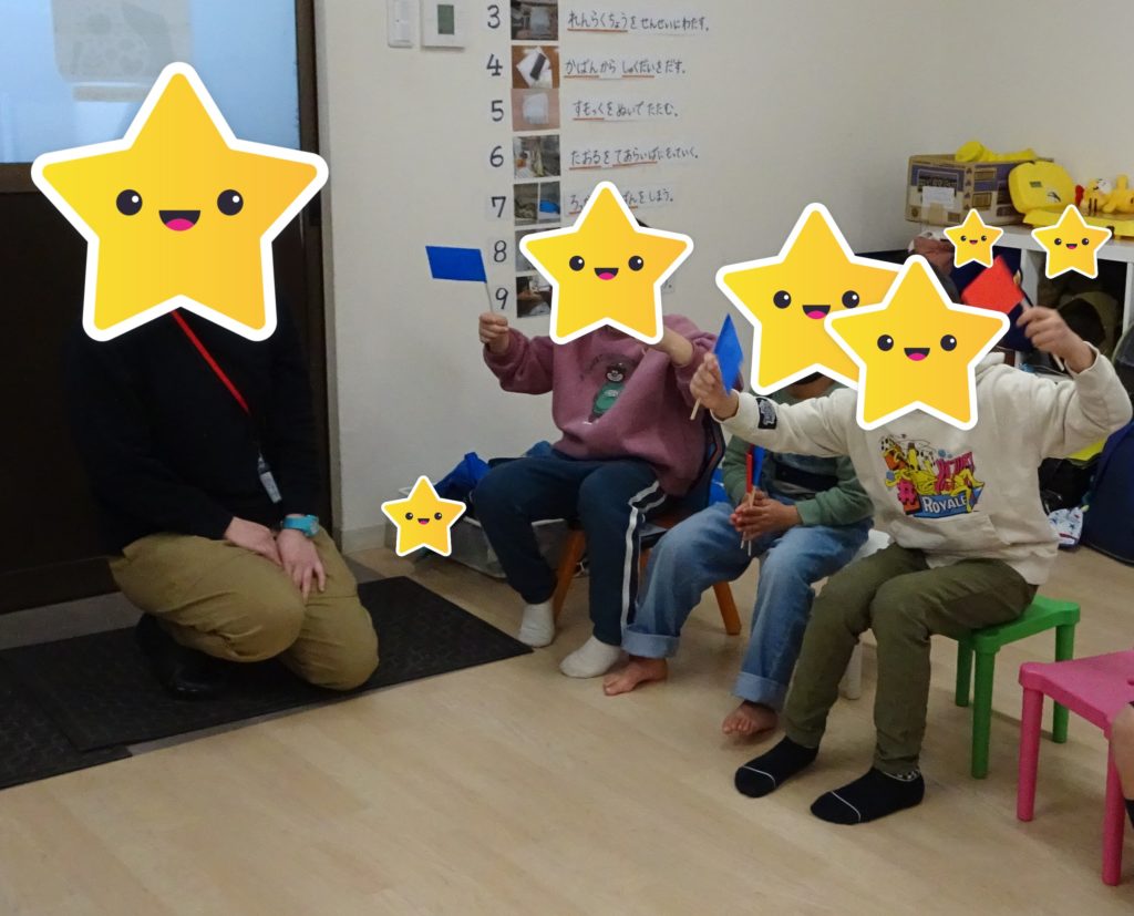 2月2日(金) 今日は、旗揚げゲームをしました。右手に青、左手に赤を持ってスタート。「赤上げて」「青下げる」スタッフが言うと、上げたり下げたりしていました。次は、子どもたちが順番に前に出て指示を出しました。上手に指示が出 […]