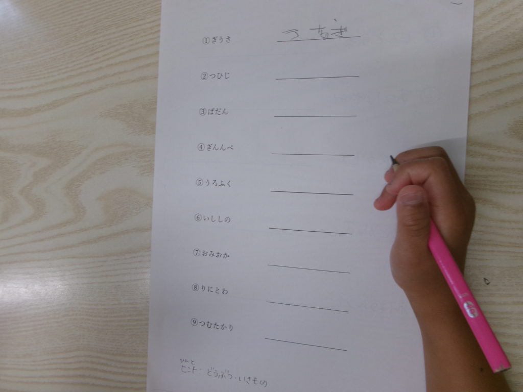 2025年8月22日(金)今日は思考探究で文字並び替えゲームをしました。 配られたプリントには、もじがバラバラになった単語がたくさん並んでいました。子どもたちは、鉛筆を持つと一斉に紙に答えを書いていきました。中には難しい […]