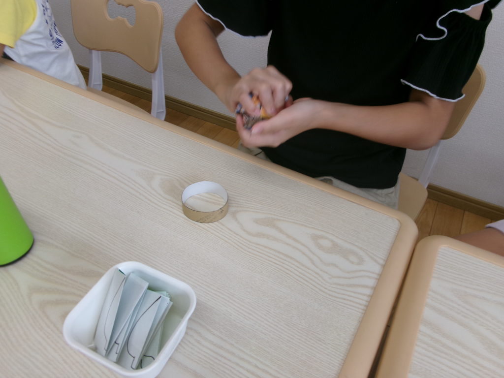 2024年9月28日(土)今日は制作でもぎれる柿をつくりました。 まず最初にチラシを丸め、その上から折り紙を使って丸めたチラシを包んでいきます。 ヘタの部分に輪ゴムを付ければ柿は完成! 次に枝の部分を作っていきます。画用 […]