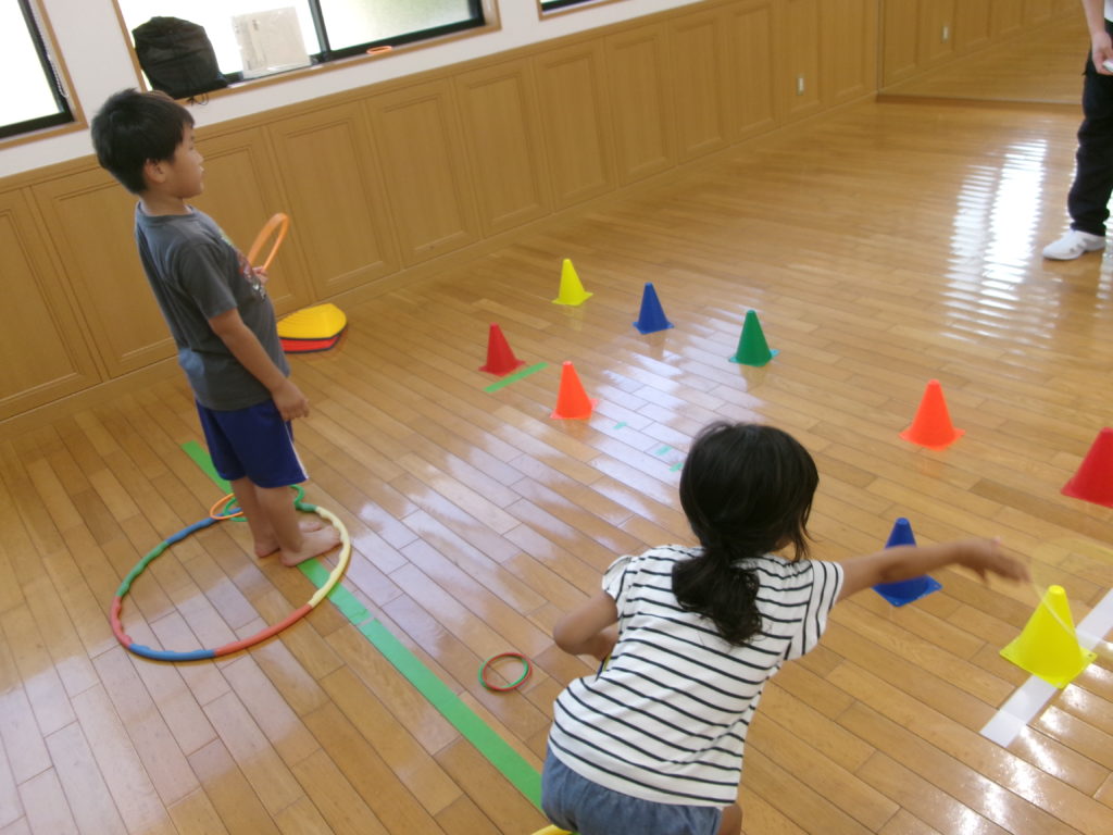 9月30日(月) 今日の運動プログラムは輪投げをしました。わっかを1人5つずつ持って、カラーコーンに向かって投げるというものです。園児さんはフラフープの中から、小学生の子はバランスストーンに立って投げました。はじめはなか […]