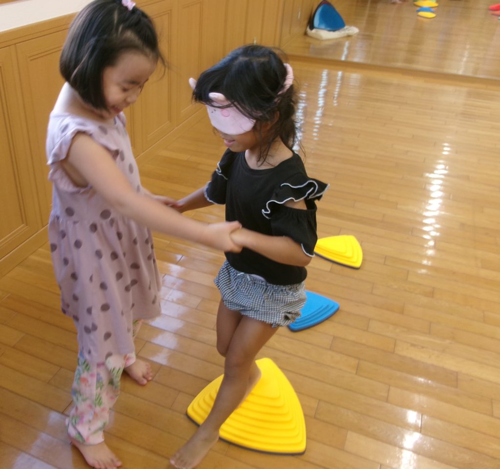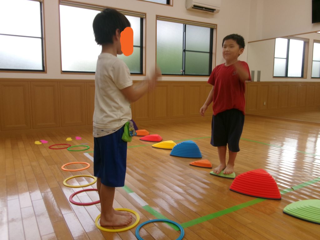 2024年9月9日(月)今日の運動プログラムは『目隠しあそび』をしました。 2人1組になって目隠しをした状態で、ブロックが置かれたコースを歩きます。 1人はブロックの上を歩く、もう一人はコースをどう進んでいけばよいか、教 […]