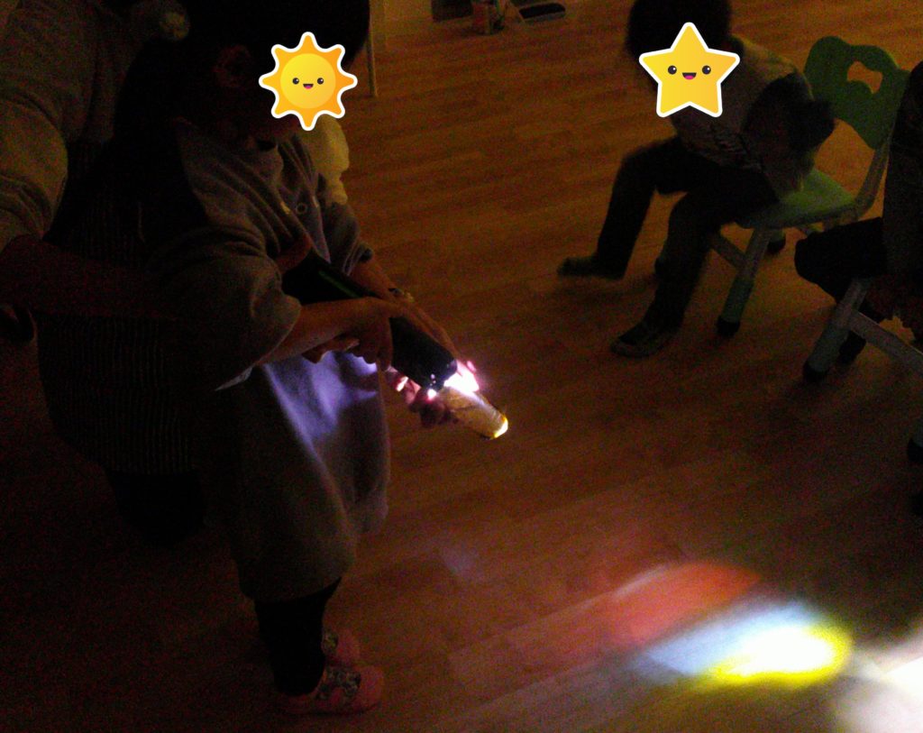 1月20日(金) カラーセロハンを重ねたものに光を当て、セロハンが重なった場所の色の変化に気が付けるかな? カラフルなセロハンをトイレットペーパーの芯に貼り付け、ライトの光を当てました。明るい部屋の中でもセロハンの重なっ […]