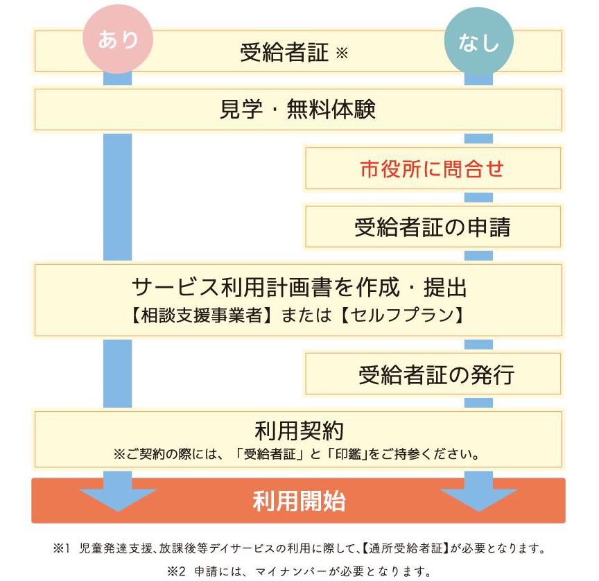 - ※受給者証の正式名称は「通所受給者証」です。児童発達支援・放課後等デイサービスのご利用には、受給者証が必要となります。