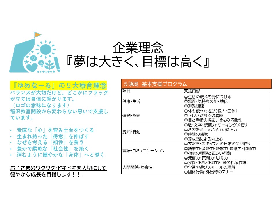 ゆめなーる稲沢教室・ゆめなーるぷち小池教室・ゆめなーるらぼ正明寺教室・ゆめなーるぐりっと奥田教室の5領域の支援プログラム